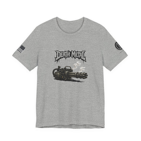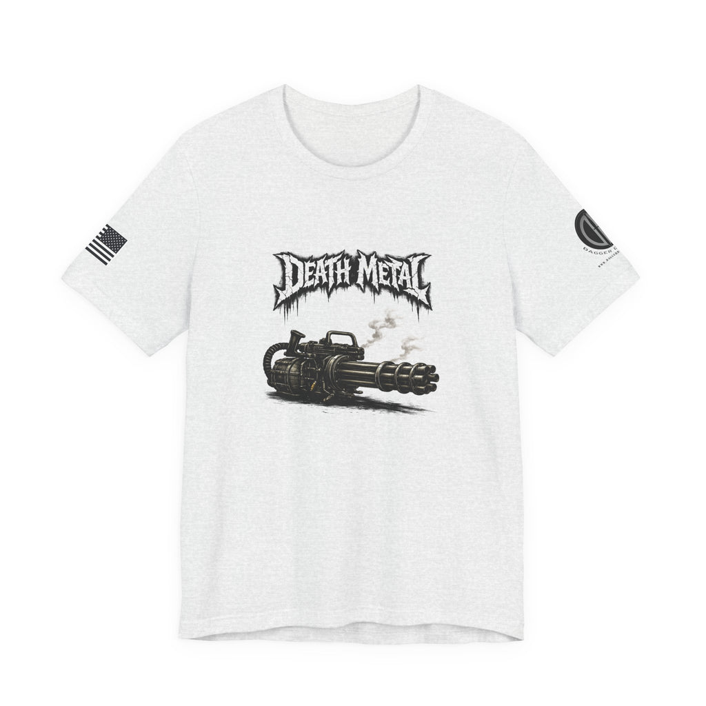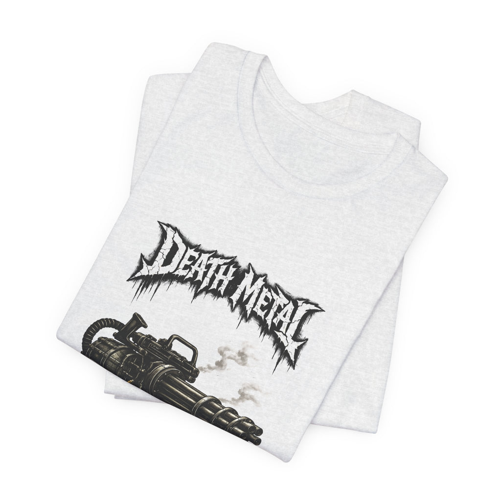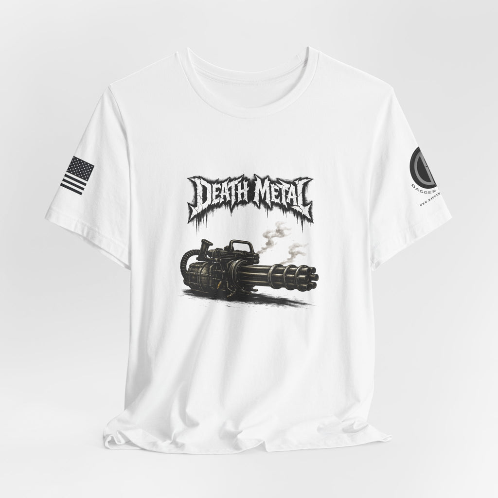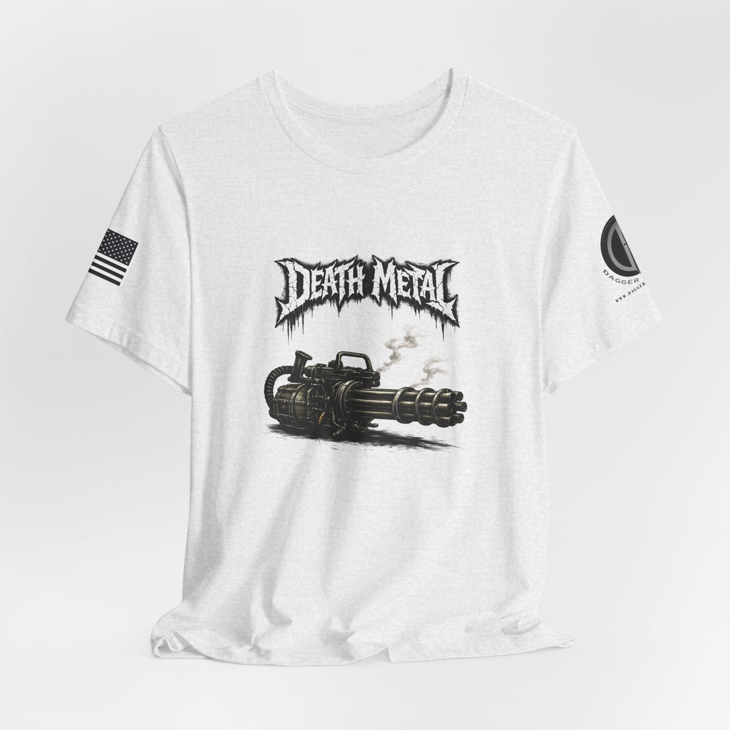 A raw, lived-in tee for those who love heavy riffs and gritty imagery. This lightweight jersey shirt carries a distressed "Death Metal" graphic and a snarling mini-gun illustration. Short sleeves sport small patch-style prints — an angled flag on one arm and a crescent emblem on the other — so the design reads from every angle without shouting. It wears slimly without clinging, breathes easily under stage lights or on street corners, and the tear-away label keeps it comfortable through long sets and long drives. Let it be the shirt you grab when you want to sweat through a marathon mosh or keep the edge on your weekend coffee run.