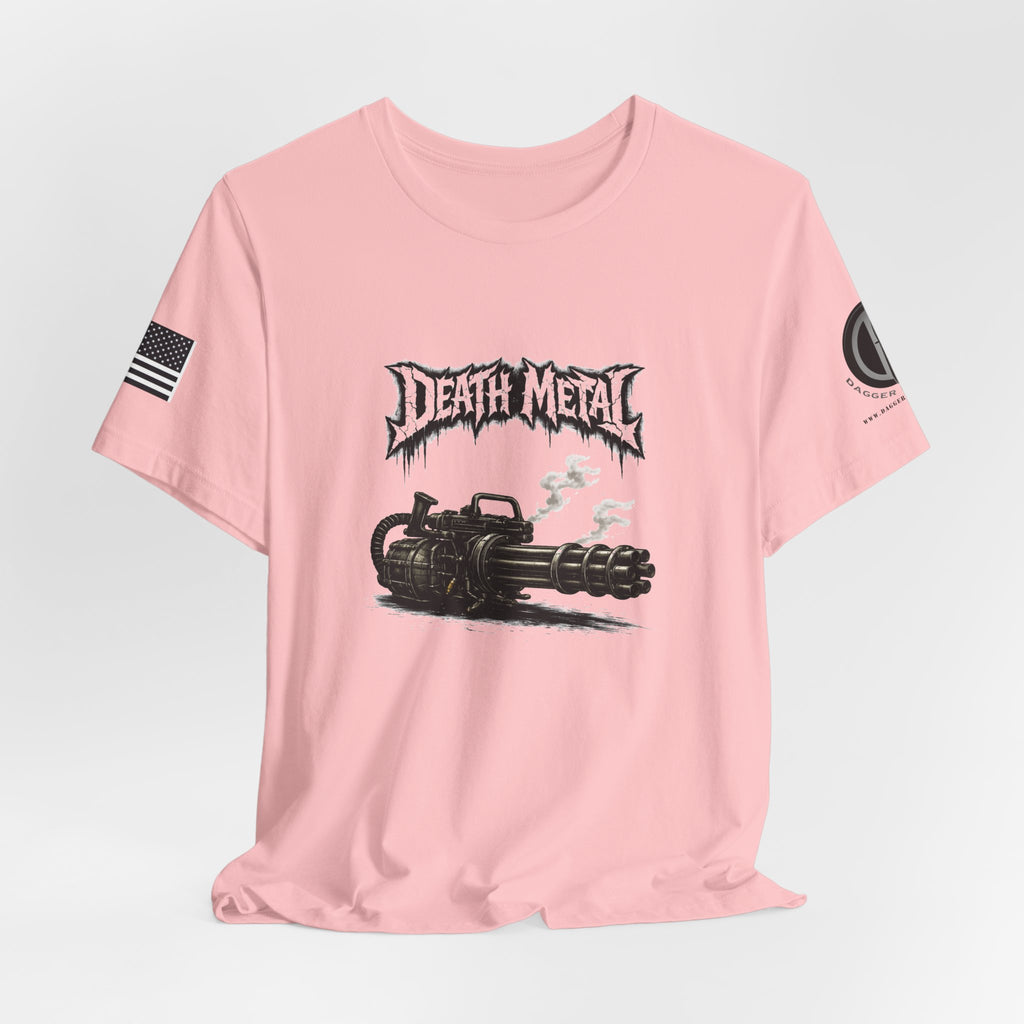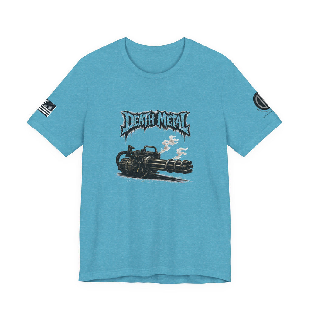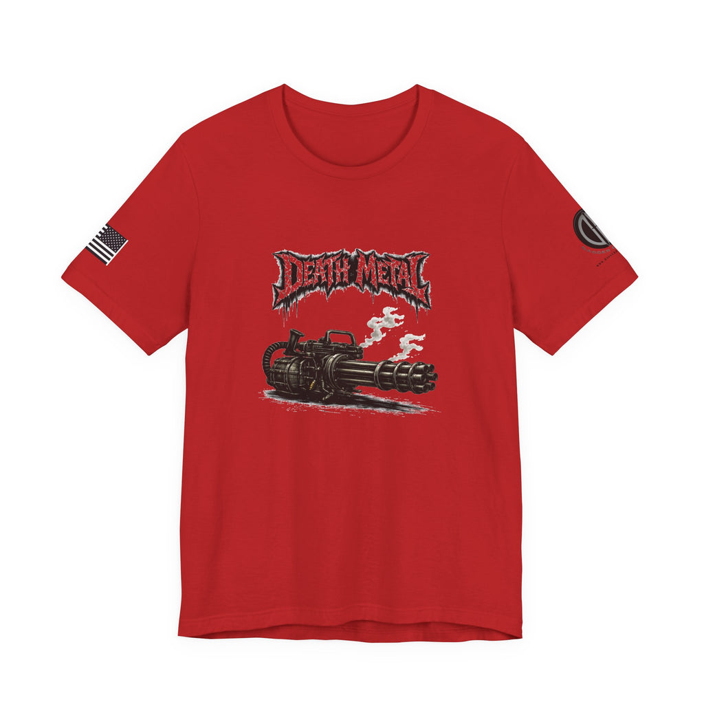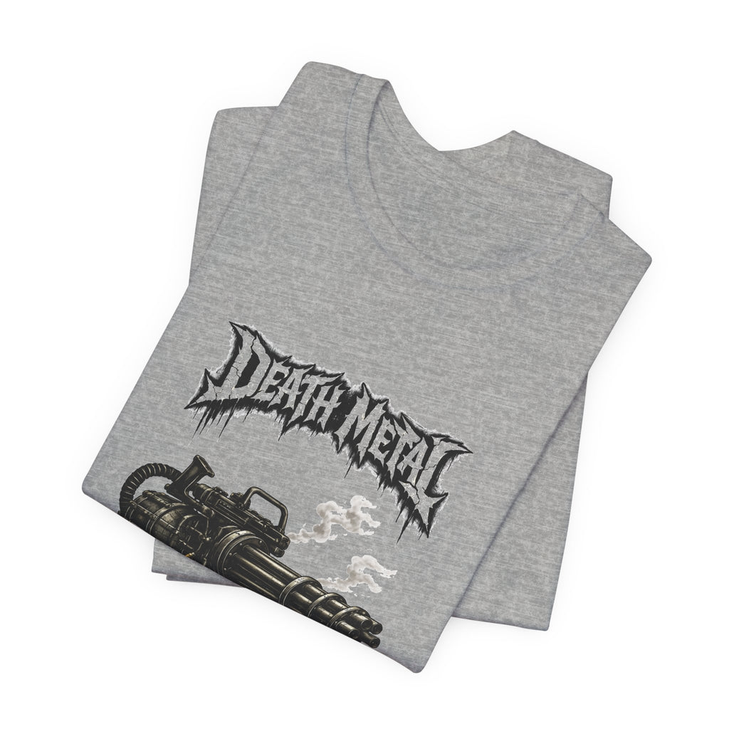 A raw, lived-in tee for those who love heavy riffs and gritty imagery. This lightweight jersey shirt carries a distressed "Death Metal" graphic and a snarling mini-gun illustration. Short sleeves sport small patch-style prints — an angled flag on one arm and a crescent emblem on the other — so the design reads from every angle without shouting. It wears slimly without clinging, breathes easily under stage lights or on street corners, and the tear-away label keeps it comfortable through long sets and long drives. Let it be the shirt you grab when you want to sweat through a marathon mosh or keep the edge on your weekend coffee run.