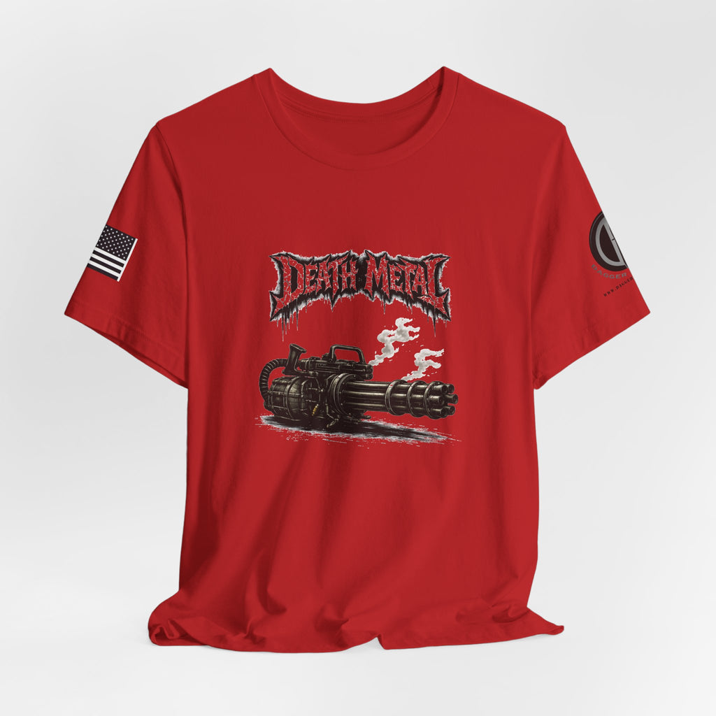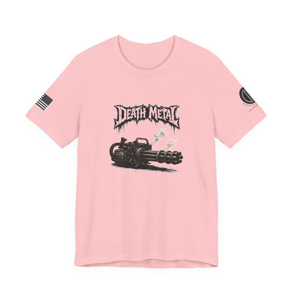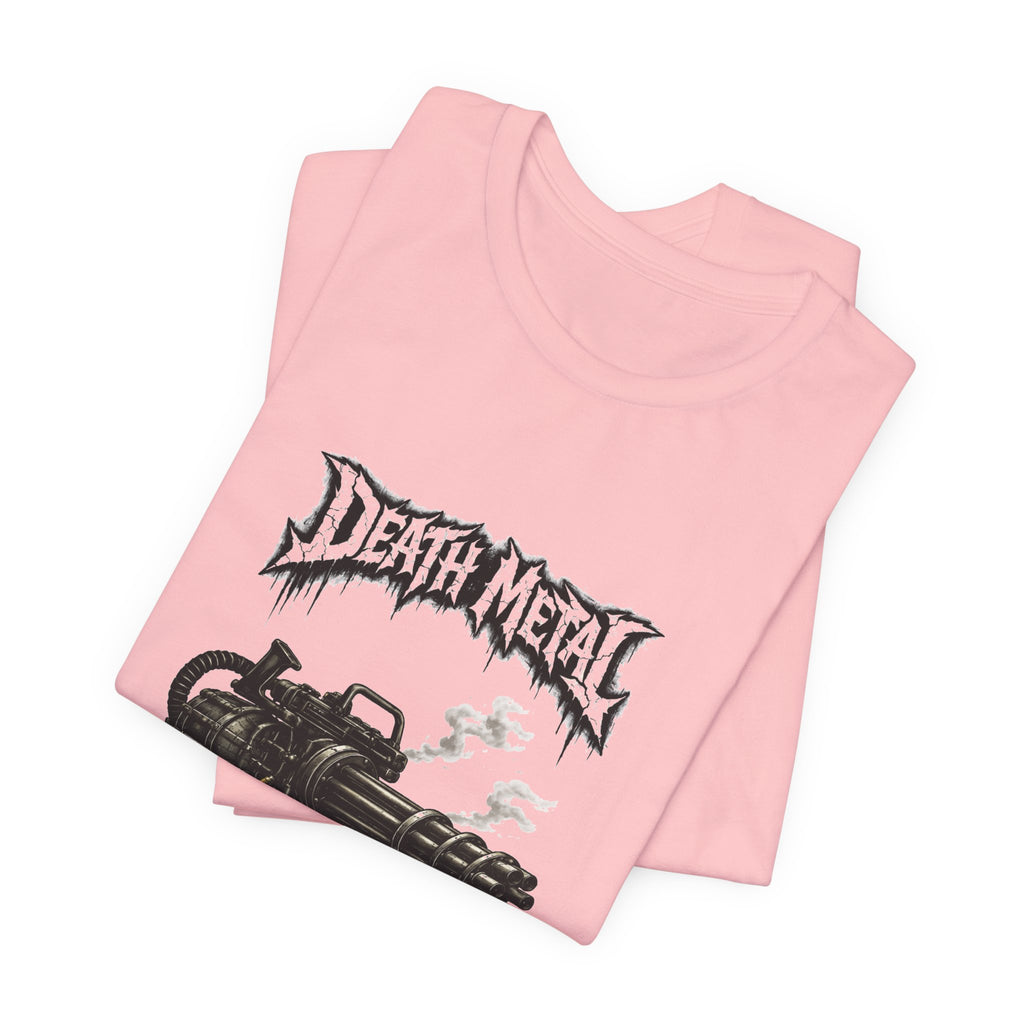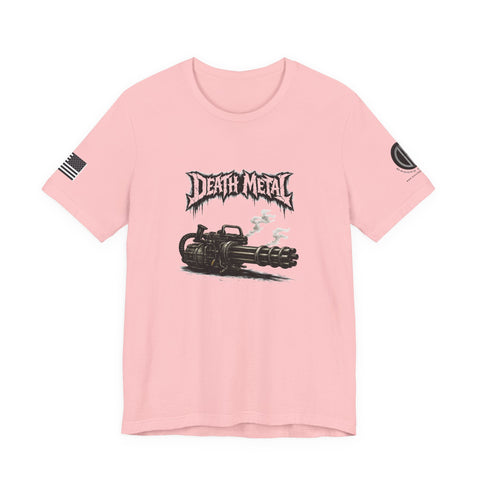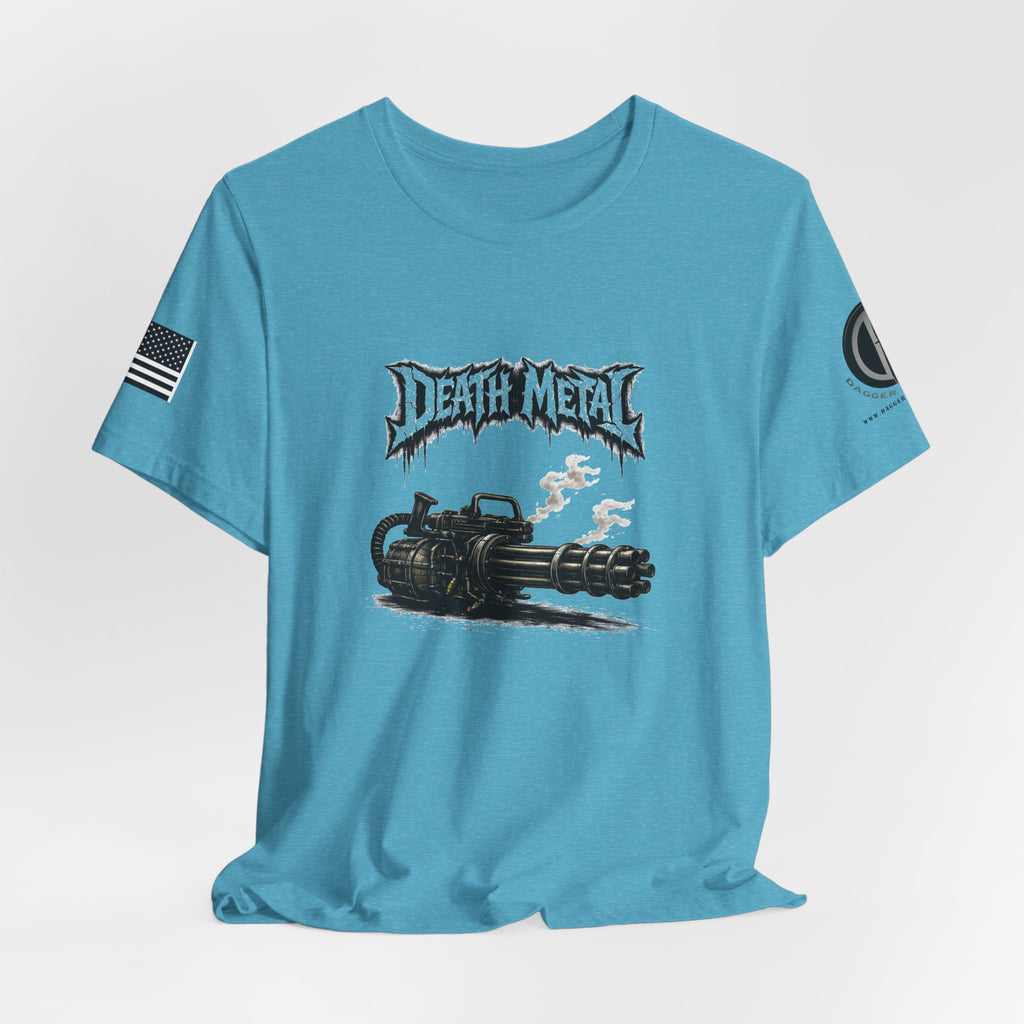 A raw, lived-in tee for those who love heavy riffs and gritty imagery. This lightweight jersey shirt carries a distressed "Death Metal" graphic and a snarling mini-gun illustration. Short sleeves sport small patch-style prints — an angled flag on one arm and a crescent emblem on the other — so the design reads from every angle without shouting. It wears slimly without clinging, breathes easily under stage lights or on street corners, and the tear-away label keeps it comfortable through long sets and long drives. Let it be the shirt you grab when you want to sweat through a marathon mosh or keep the edge on your weekend coffee run.