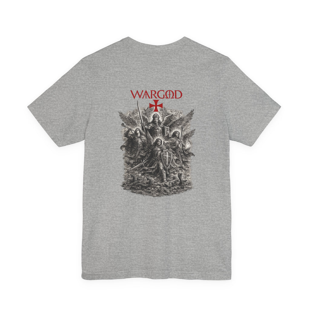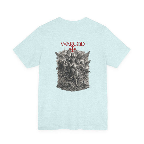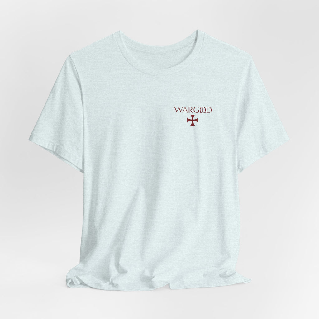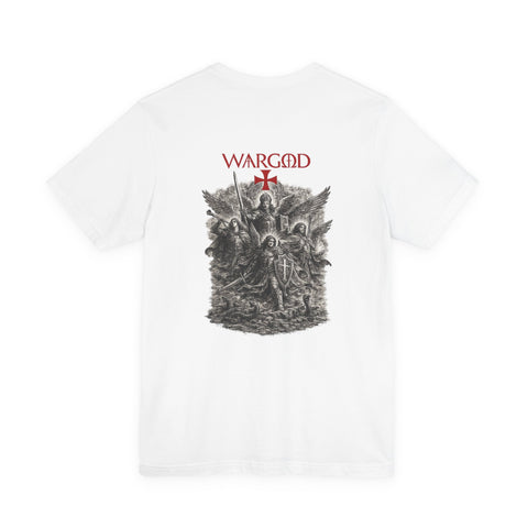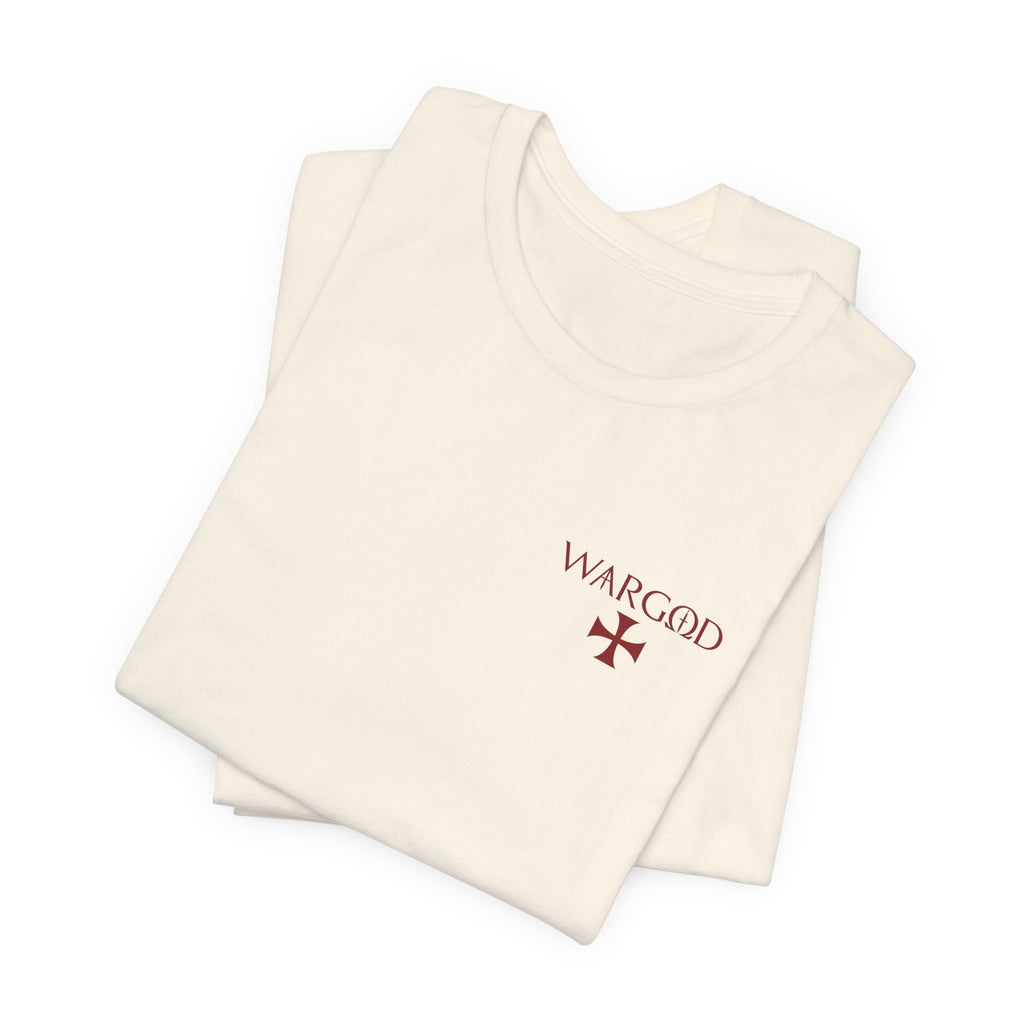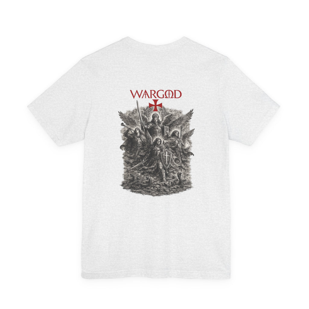 This lightweight crew-neck tee wears like a quietly confident statement. Made from breathable Airlume combed and ring-spun cotton, it pairs a slim retail fit with thoughtful construction—side seams for shape retention, ribbed knit collar with seam, and shoulder tape for stability. The front carries a small, understated WARGOD logo and cross, while the back reveals an intricate, darkly atmospheric illustration of armored figures and angels—textured, vintage engraving-style artwork that reads like a page from an old chronicle. Wear it layered under a jacket on a cool evening or loose with jeans when you want to let the art speak. Responsible production credentials and a tear-away label keep comfort and ethics front and center.
