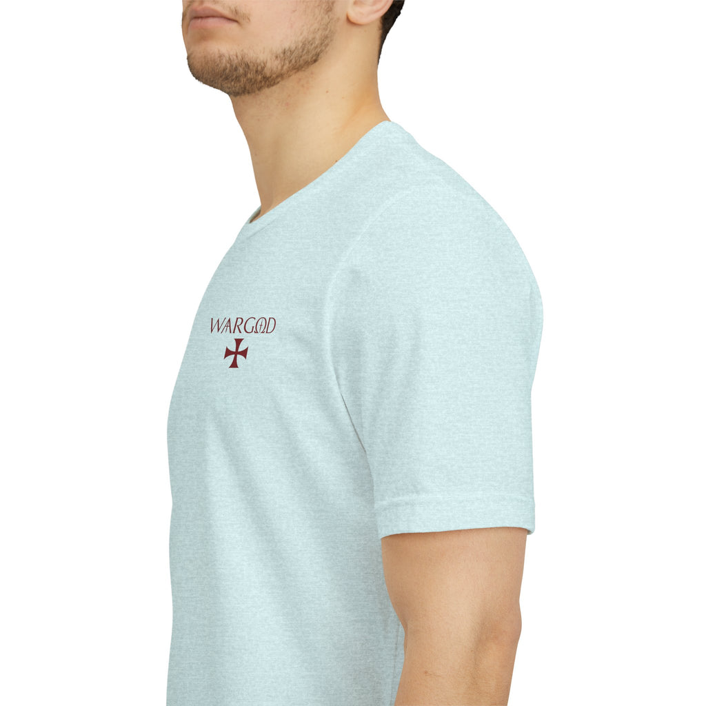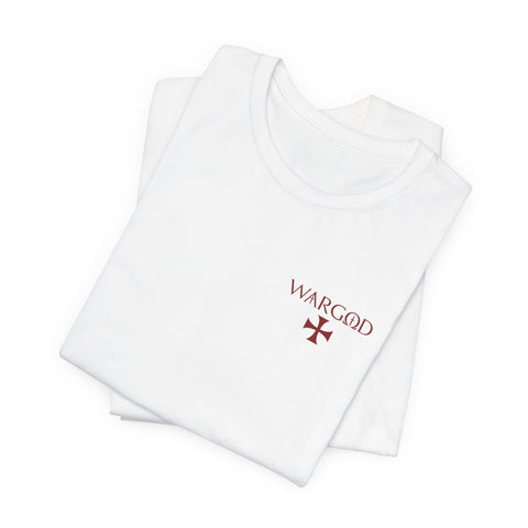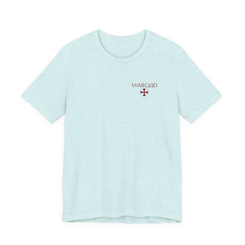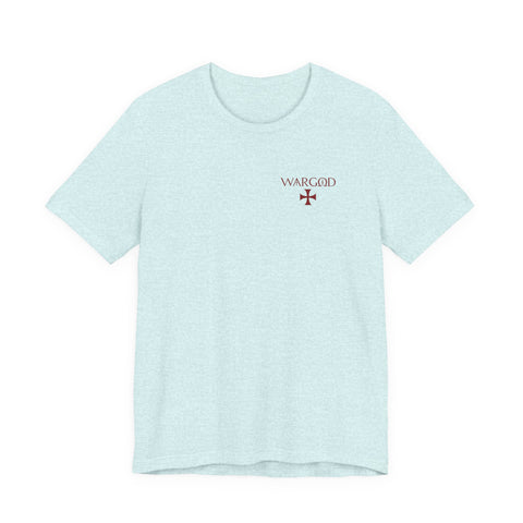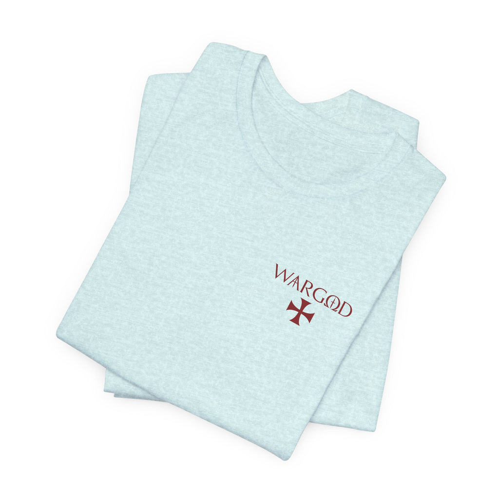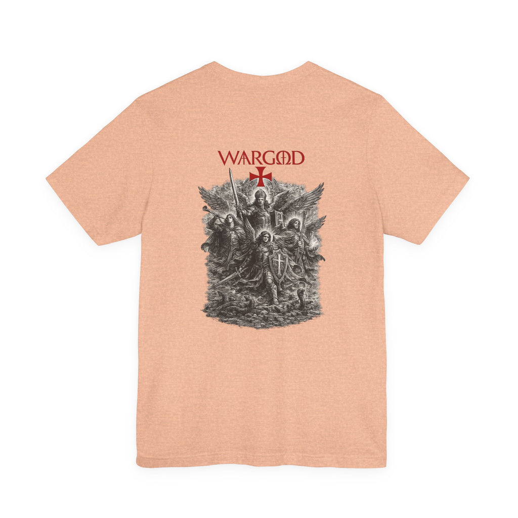 This lightweight crew-neck tee wears like a quietly confident statement. Made from breathable Airlume combed and ring-spun cotton, it pairs a slim retail fit with thoughtful construction—side seams for shape retention, ribbed knit collar with seam, and shoulder tape for stability. The front carries a small, understated WARGOD logo and cross, while the back reveals an intricate, darkly atmospheric illustration of armored figures and angels—textured, vintage engraving-style artwork that reads like a page from an old chronicle. Wear it layered under a jacket on a cool evening or loose with jeans when you want to let the art speak. Responsible production credentials and a tear-away label keep comfort and ethics front and center.